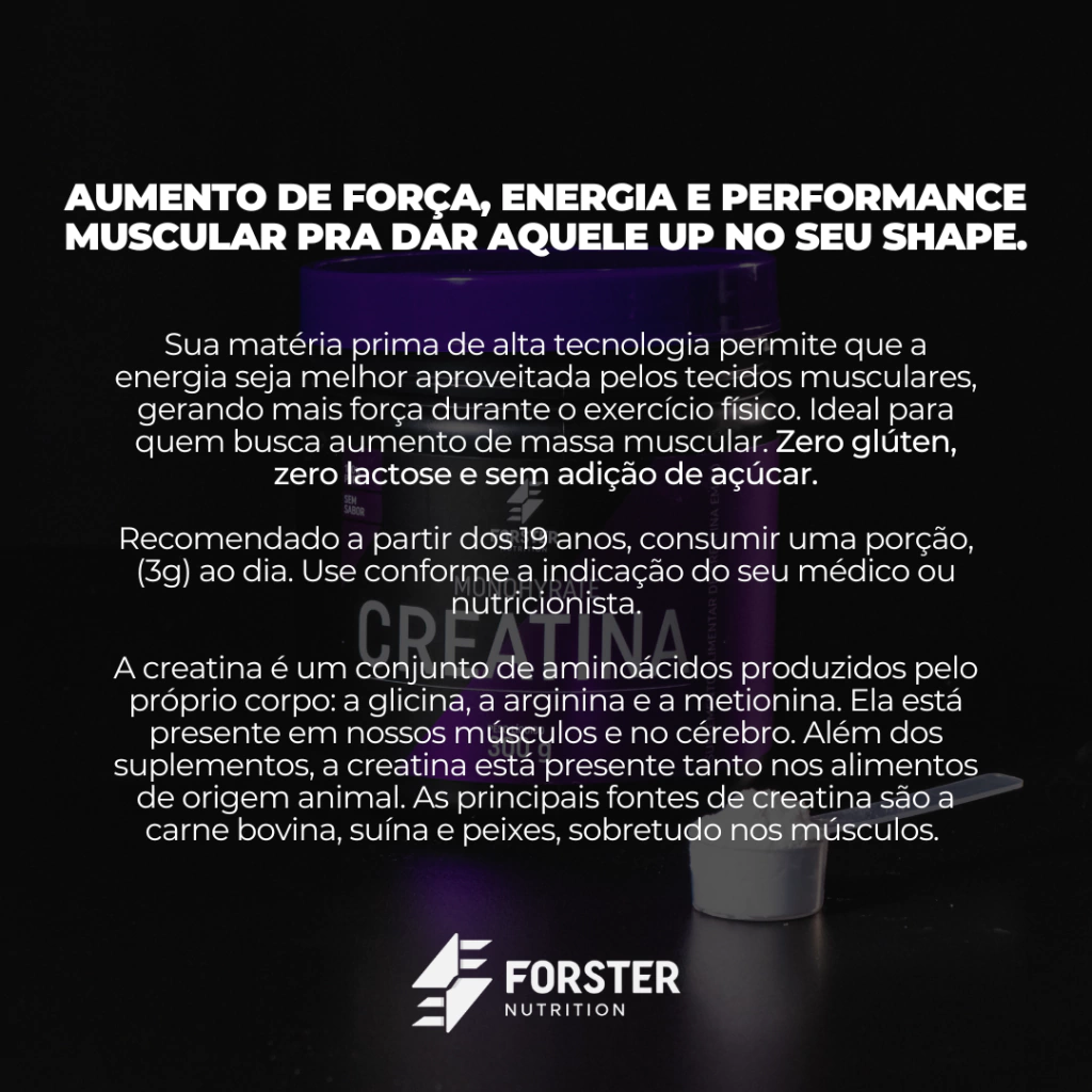 Em sua dose de 3 g (1 medida), fornece 3 g de creatina monohidratada. Zero glúten, zero lactose e sem adição de açúcar.